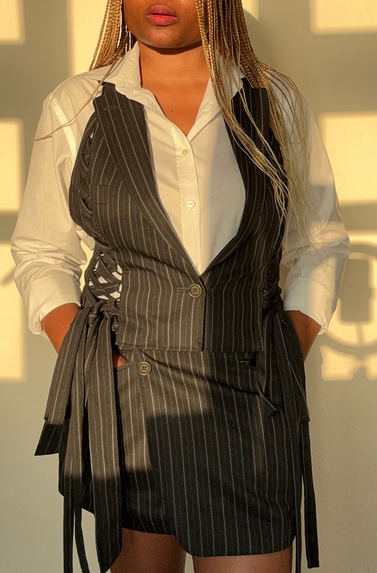Upcycled waistcoats with adjustable criss-cross tie detail on one side made from...