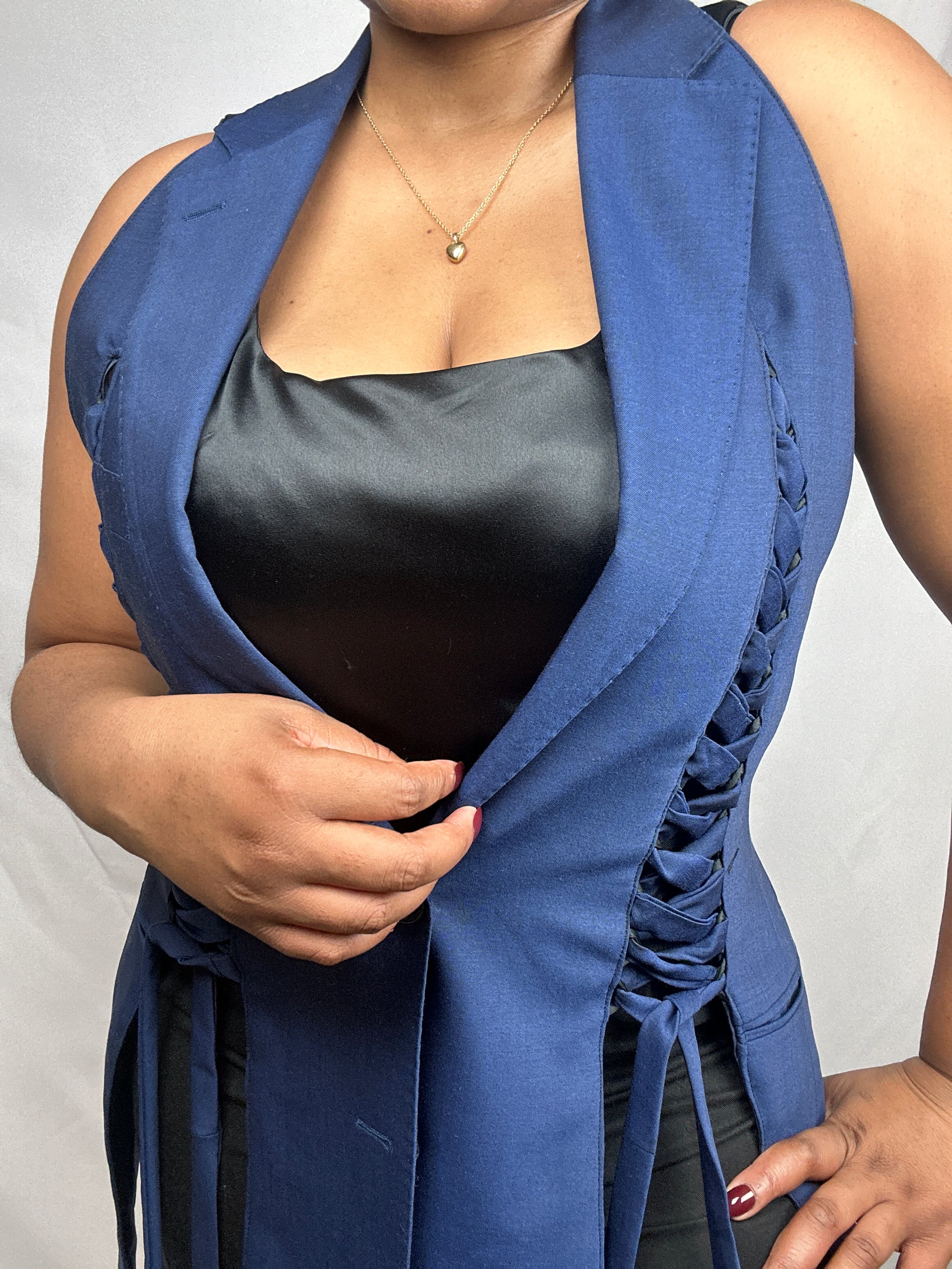 The signature upcycled waistcoat with an open back made from a preloved suit. Featuring the Sarafina M signature plaited strap on both sides made from the same material as the blazer.
