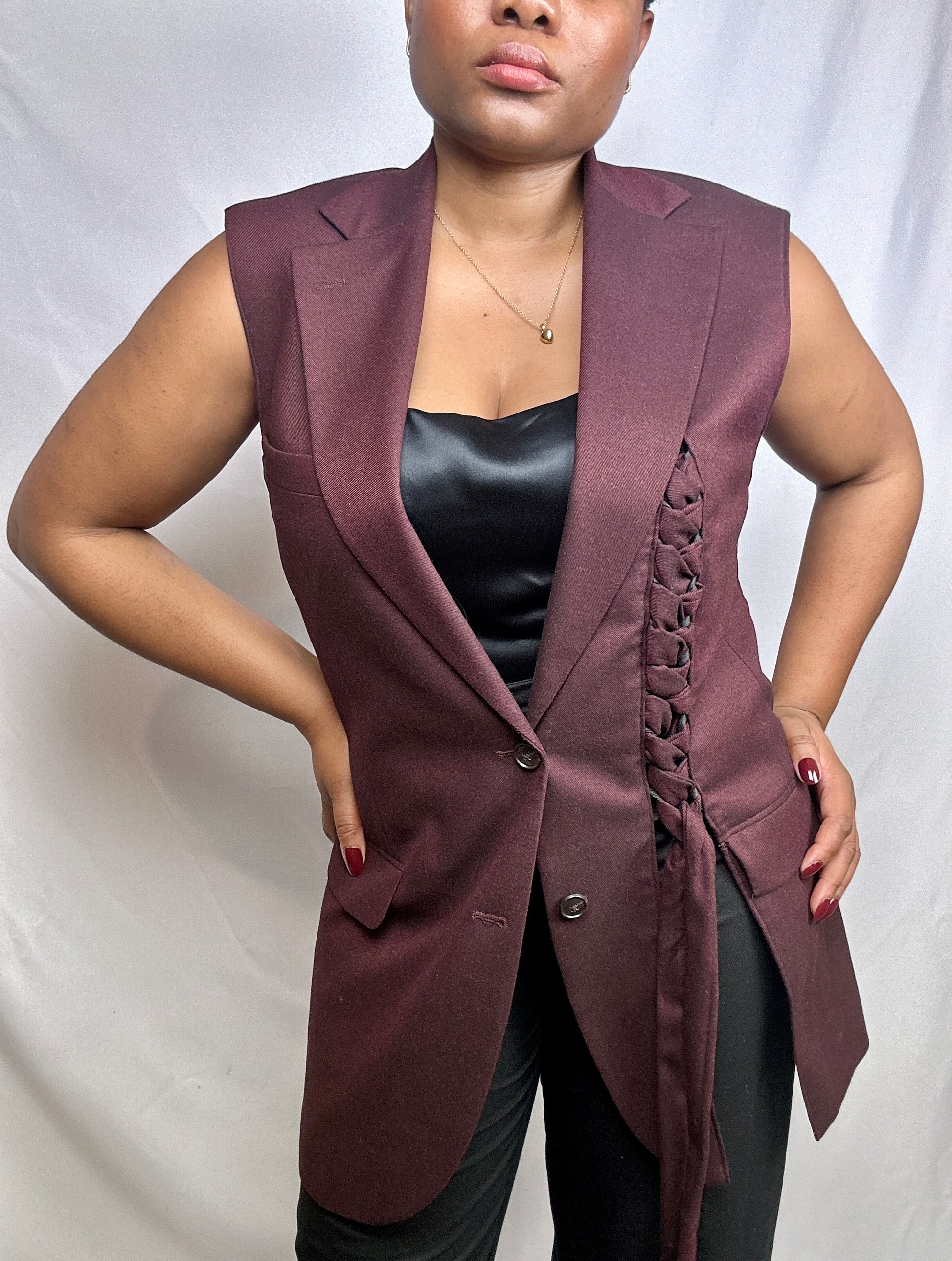 The signature upcycled waistcoat made from a preloved suit. Featuring the Sarafina M signature plaited strap made from the same material as the blazer.